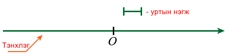 Тэнхлэгт 0 нь O цэгтэй давхцана. Ингэснээр эерэг, сөрөг, эсхүл тэг дурын тоог тэнхлэгт зөвхөн нэг цэгээр төлөөлүүлэн үзүүлж болно.