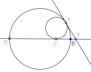 Зурагт өгөгдсөн дотоод байдлаараа шүргэлцсэн хоёр тойргийн TA нь ерөнхий шүргэгч, TC нь том тойргийн огтлогч, жижиг тойргийн шүргэгч болно. DC=3, CB=2 бол TA -г ол.