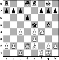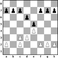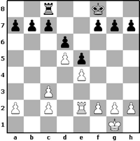 Үүний зэрэгцээ идэвхитэй сул талаас идэвхигүй буюу статик сул талыг салган ойлгох ёстой. Идэвхигүй сул тал давхар хүүтэй массийн хөдөлгөөнд бус харин эсрэгээрээ бид давхар хүүтэй массийг довтлох үед илэрнэ. Зурагт үзүүлсэн байрлалд давхар хүүнүүдийн идэвхигүй сул тал илхэн харагдана. Энд 1...c6 2.dxc6 Трxc6 эсхүл 1...c6 2.c4 cxd5 3.cxd5 Трc3 гээд дараа нь Трa3 гэнэ. Аль ч тохиолдолд хар давуу болно. Эндээс давхар хүүнүүдийн статик сул талыг тэдний давхарлалт арилахаас болгоомжилгүй тэдэнд дайрах замаар ашиглана. Сул талын хагас нь байхгүй болох ч нөгөө хагас нь үлдэх л болно. |